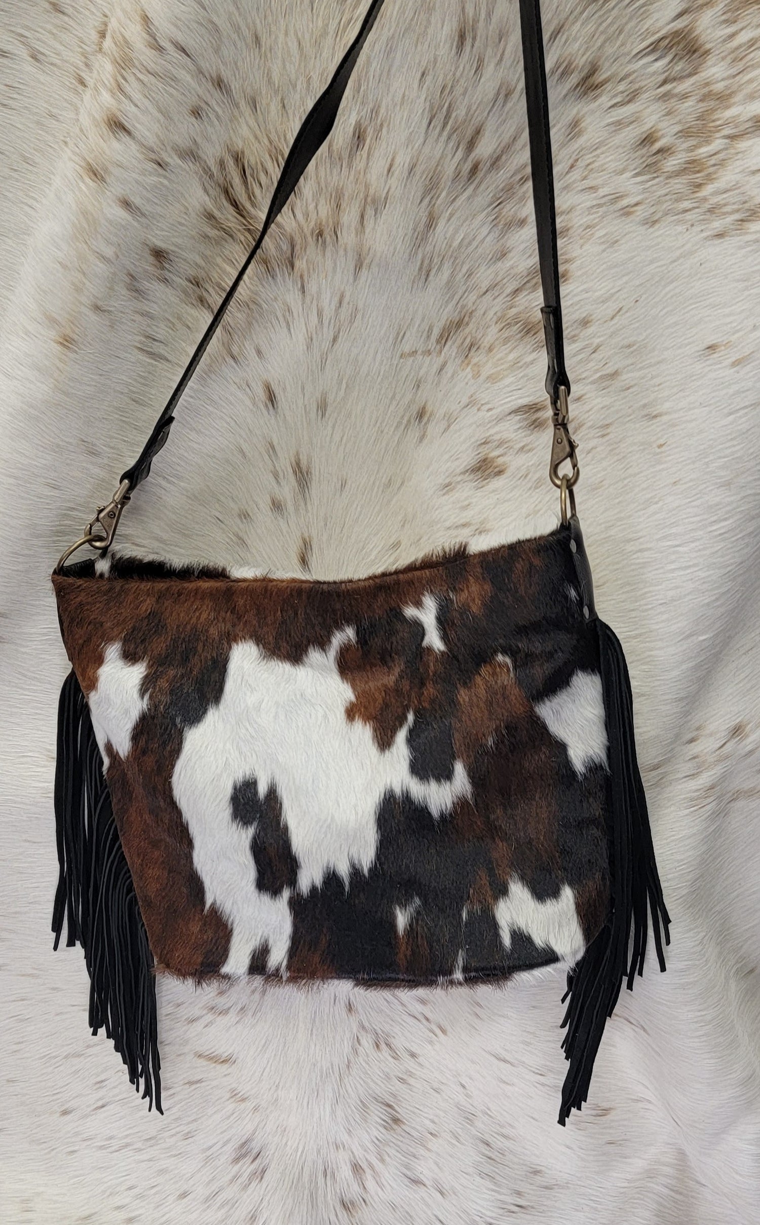 Crossbody Cowhide Bucket Purse With Fringe Purse measurements; 16 in x 12 in x 6.5in Each...