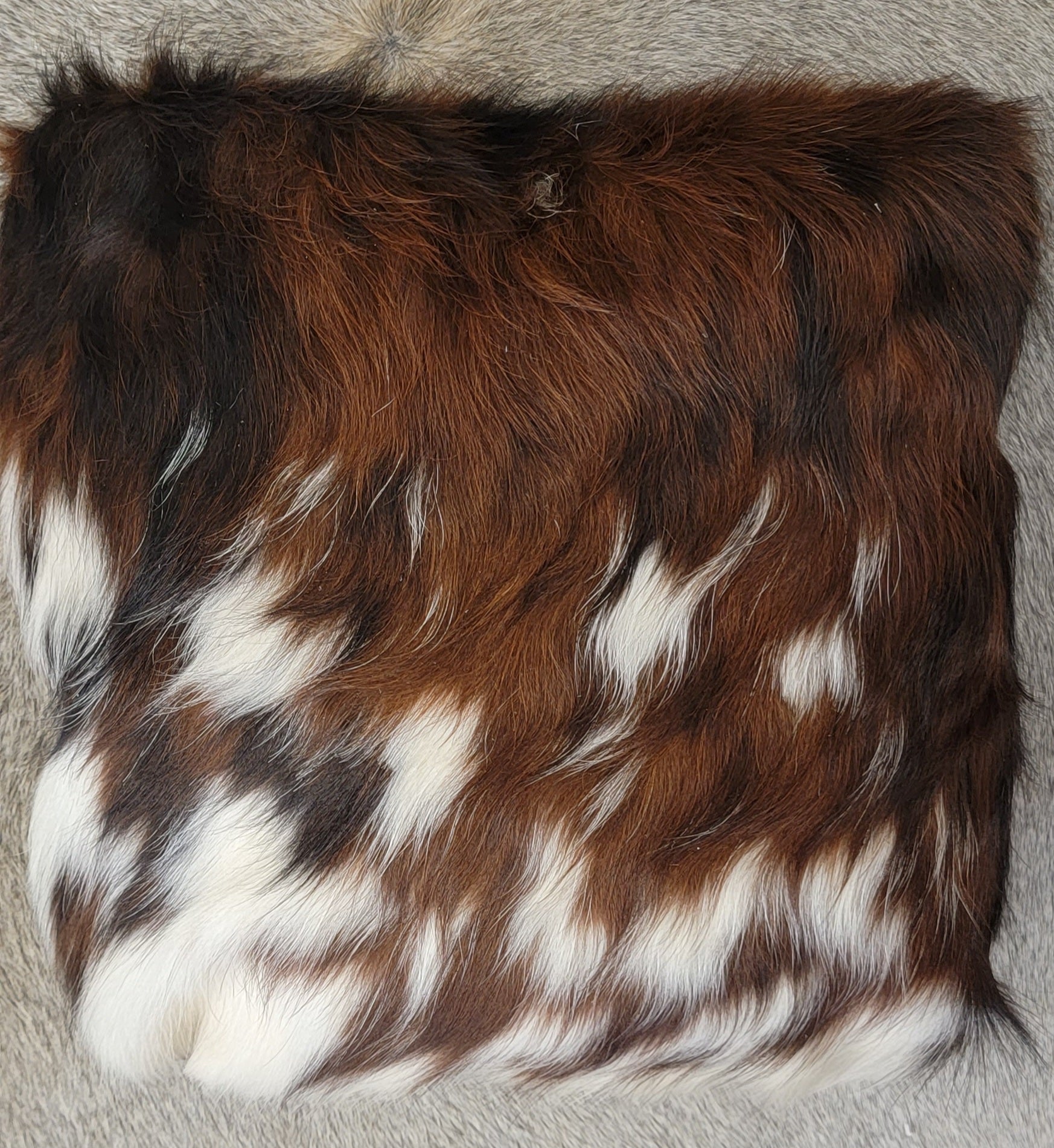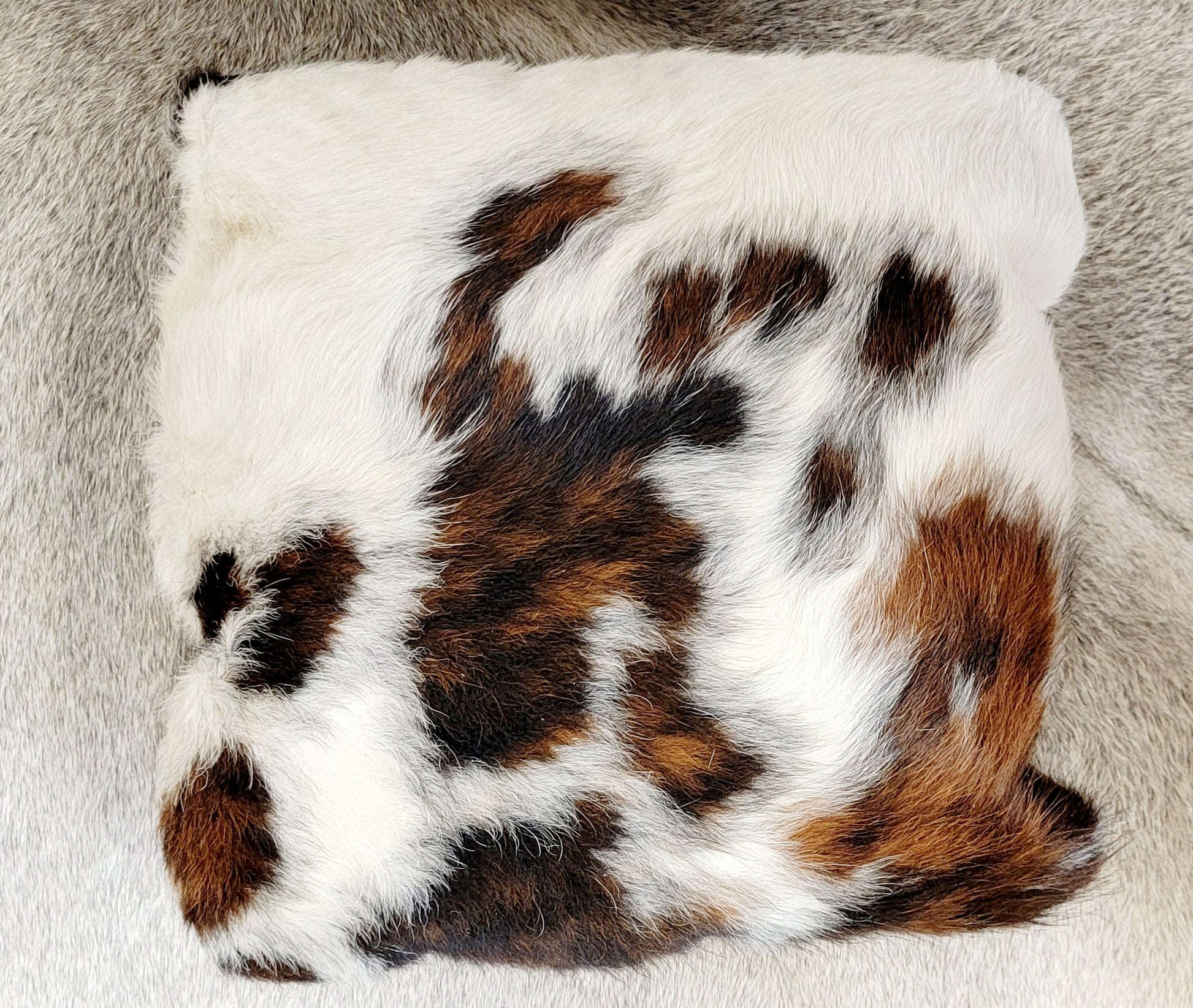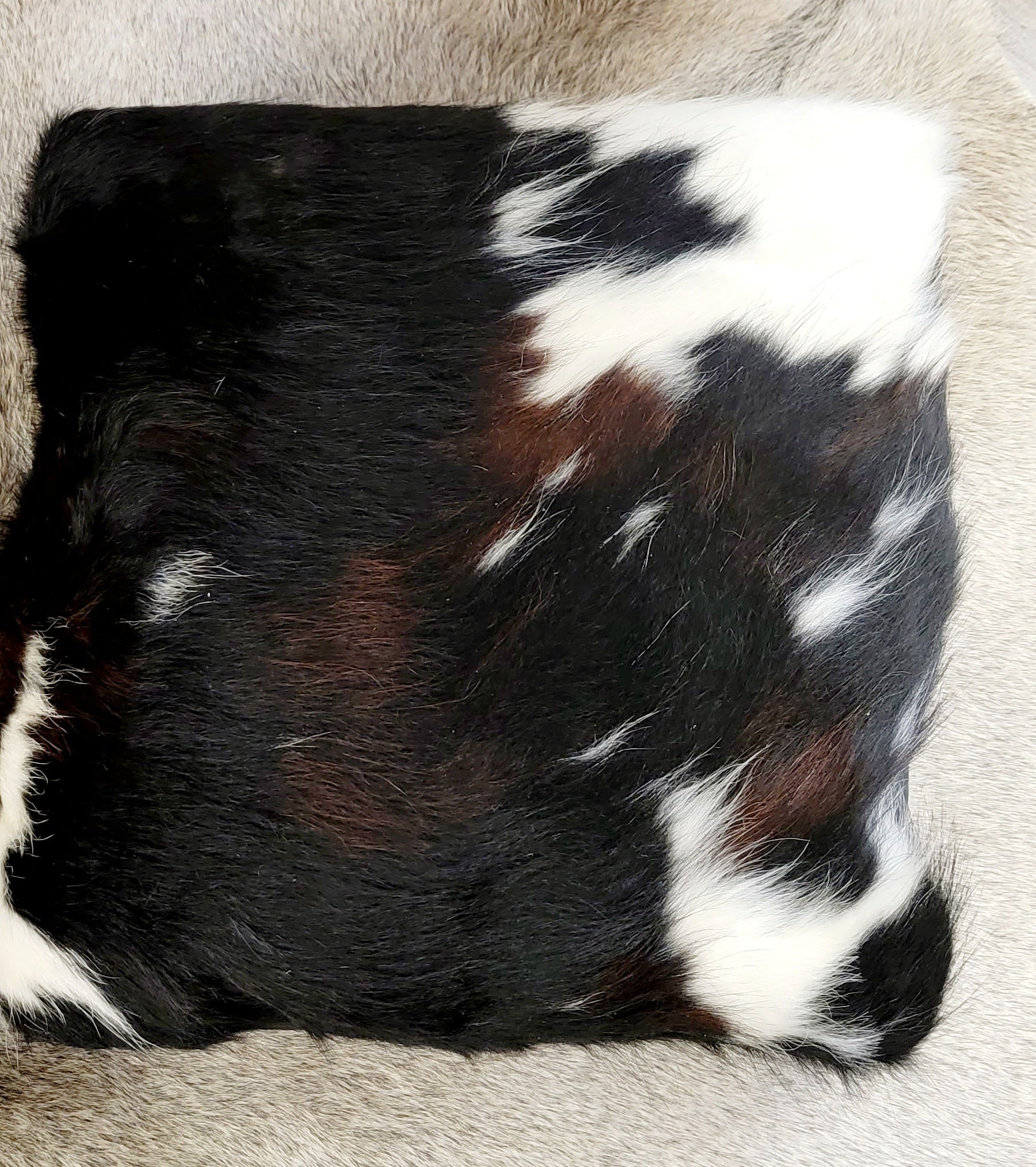 Fluffy tri-colored fur cowhide on front with either black or brown ,red white ,Brindle in every tone, Light palomino etc.