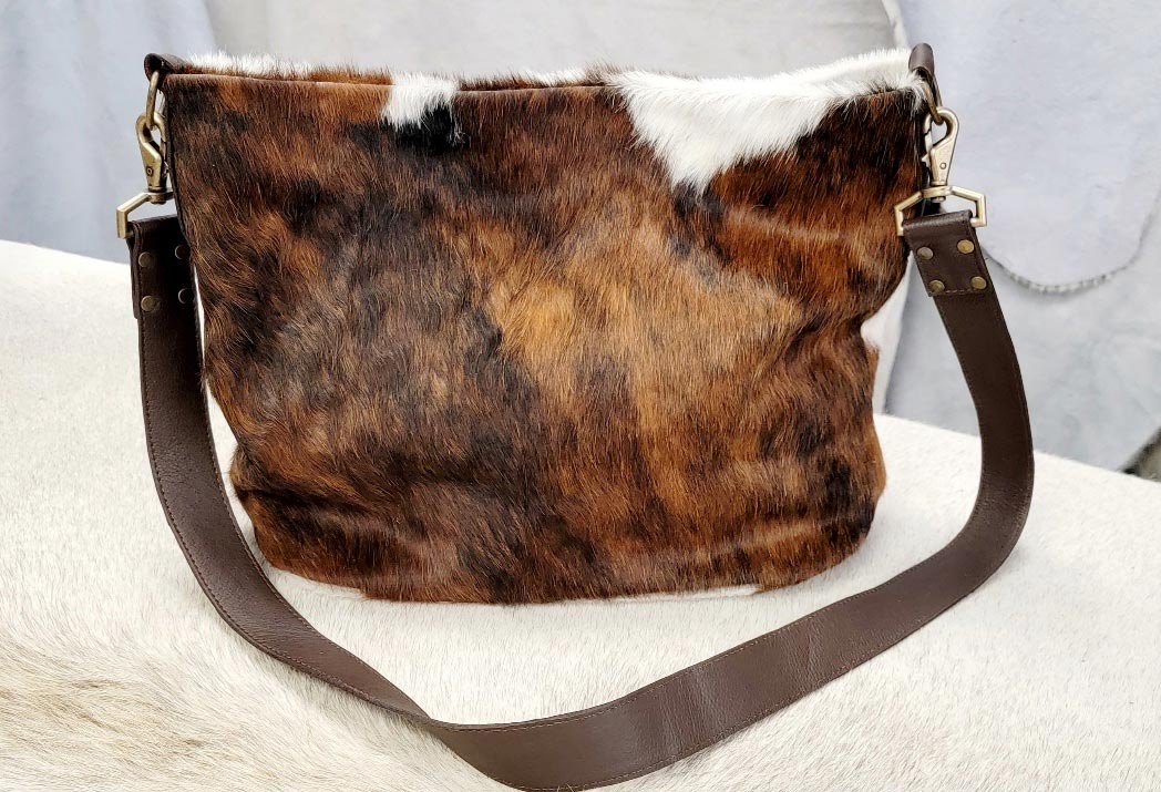 Embrace the luxurious charm of this dark-toned Crossbody Cowhide Bucket Purse. Made from 100% Brazilian cowhide, this purse combines sophistication with functionality for fashion enthusiasts such as you!